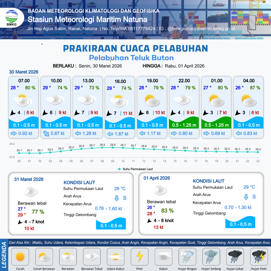 30 Mar 26, 15.00 2 jam kedepan | Timur Laut 4 kt Gust Peningkatan kecepatan angin yang singkat dan tiba-tiba : 9 kt | 0.6 m Rendah | Timur 0.8 Knot | 10 km | 28 °C | 79 % | +0.31 m | |