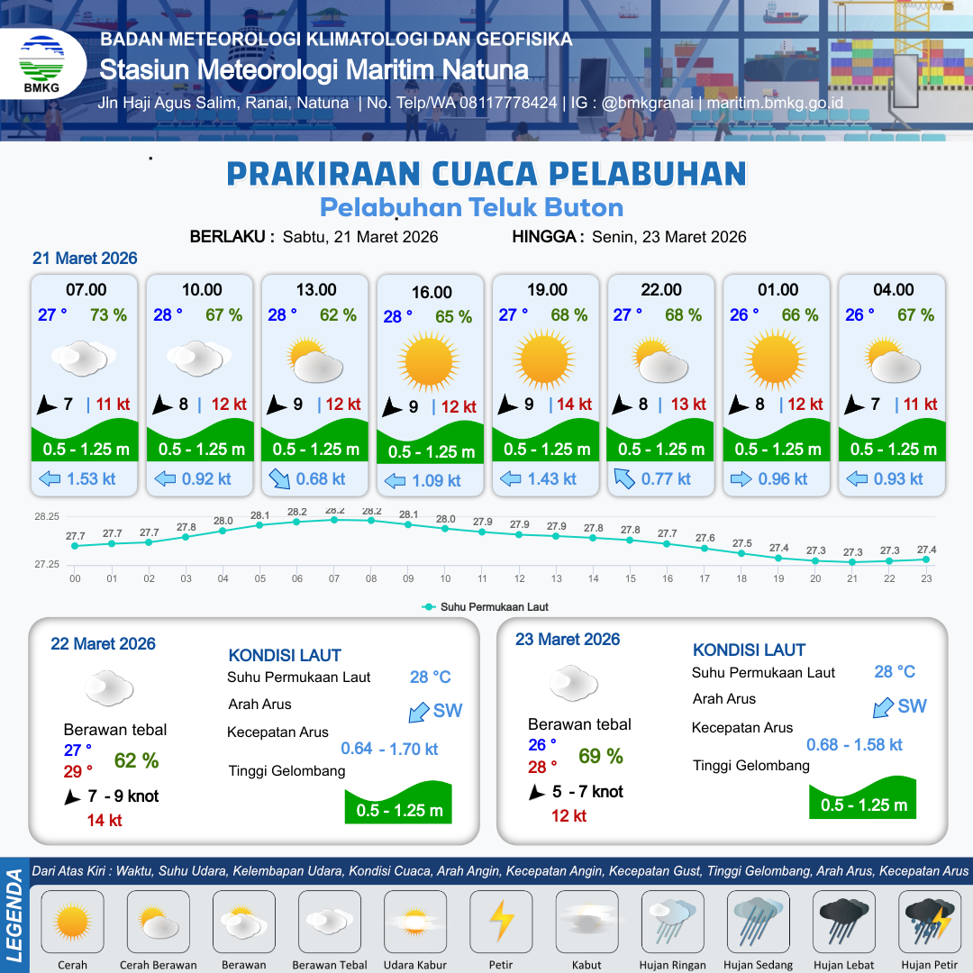 21 Mar 26, 14.00 12 jam kedepan | Timur Laut 8 kt Gust Peningkatan kecepatan angin yang singkat dan tiba-tiba : 13 kt | 0.9 m Rendah | Barat 1.1 Knot | 10 km | 27 °C | 68 % | -0.21 m | |