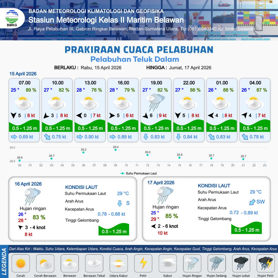 15 Apr 26, 15.00 2 jam kedepan | Utara 5 kt Gust Peningkatan kecepatan angin yang singkat dan tiba-tiba : 8 kt | 0.8 m Rendah | Selatan 0.8 Knot | 7 km | 27 °C | 86 % | +0.51 m | |