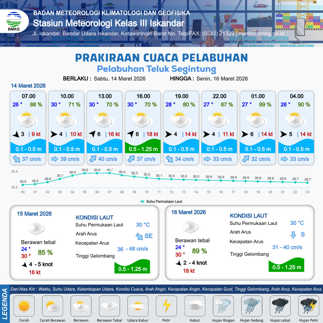 14 Mar 26, 07.00 12 jam yang lalu | Berawan | Barat Daya 6 kt Gust Peningkatan kecepatan angin yang singkat dan tiba-tiba : 16 kt | | | 10 km | 30 °C | 71 % | +1.17 m |
