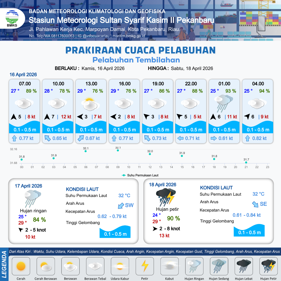 16 Apr 26, 23.00 20 jam kedepan | Barat Daya 5 kt Gust Peningkatan kecepatan angin yang singkat dan tiba-tiba : 10 kt | 0.3 m Tenang | Utara 0.8 Knot | 8 km | 25 °C | 95 % | +0.68 m |