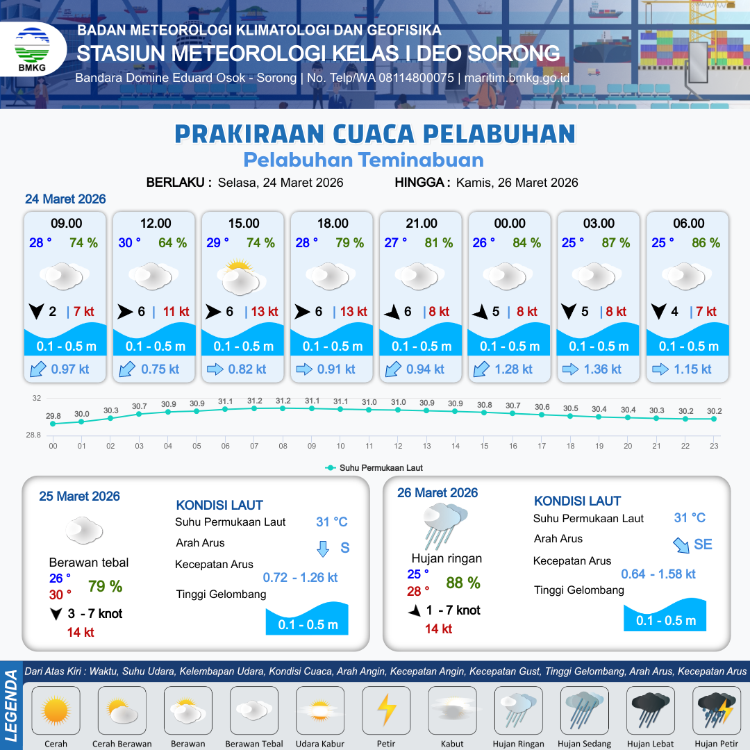 24 Mar 26, 04.00 14 jam yang lalu | Berawan Tebal | Barat 6 kt Gust Peningkatan kecepatan angin yang singkat dan tiba-tiba : 12 kt | | | 8 km | 30 °C | 67 % | -0.80 m |