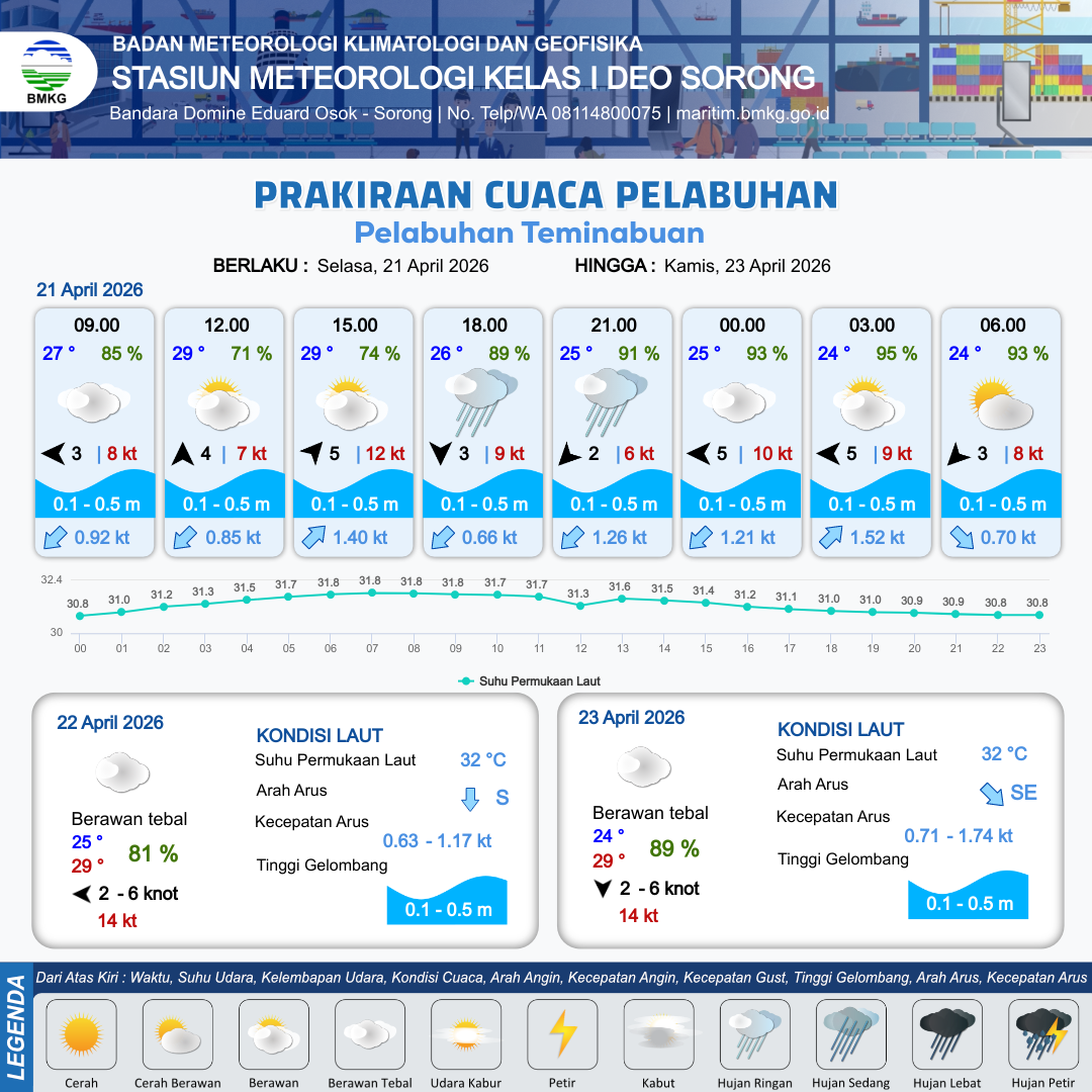 21 Apr 26, 16.00 2 jam yang lalu | Berawan Tebal | Timur 5 kt Gust Peningkatan kecepatan angin yang singkat dan tiba-tiba : 9 kt | | | 10 km | 25 °C | 94 % | -1.79 m |
