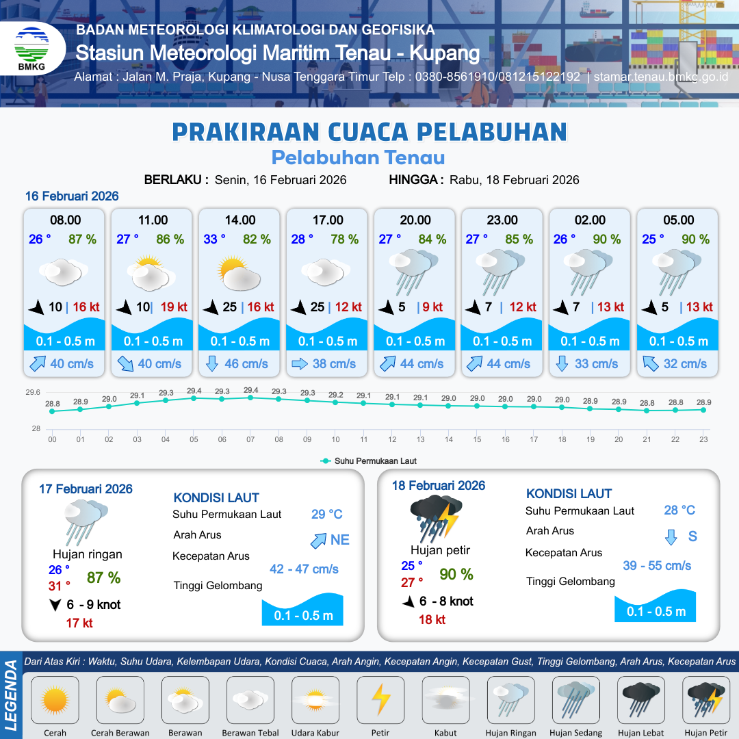 16 Feb 26, 04.00 14 jam yang lalu | Berawan | Barat Laut 10 kt Gust Peningkatan kecepatan angin yang singkat dan tiba-tiba : 17 kt | | | 8 km | 29 °C | 81 % | +0.65 m |