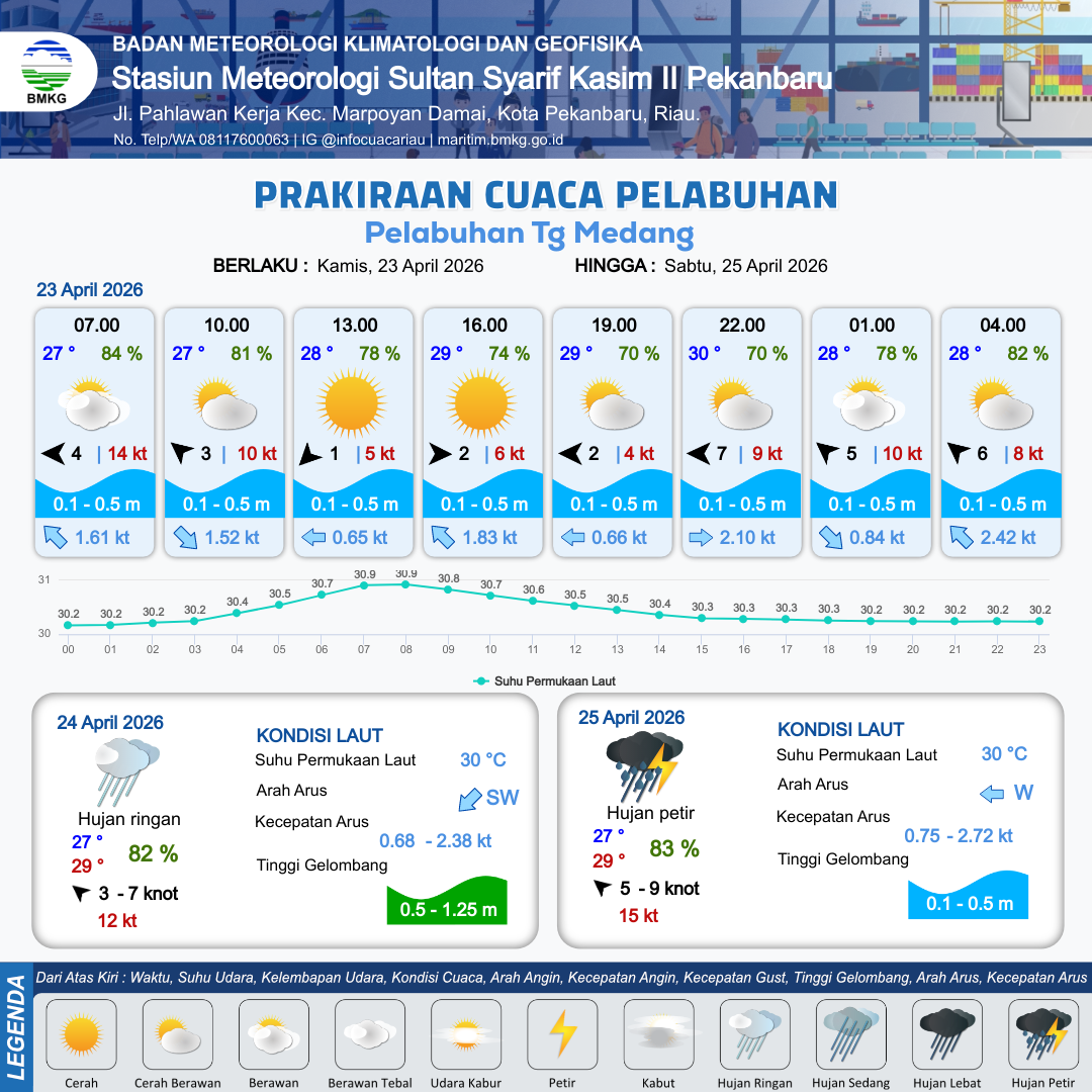 23 Apr 26, 04.00 18 jam kedepan | Tenggara 3 kt Gust Peningkatan kecepatan angin yang singkat dan tiba-tiba : 4 kt | 0.3 m Tenang | Tenggara 1.4 Knot | 10 km | 27 °C | 80 % | +0.43 m | |