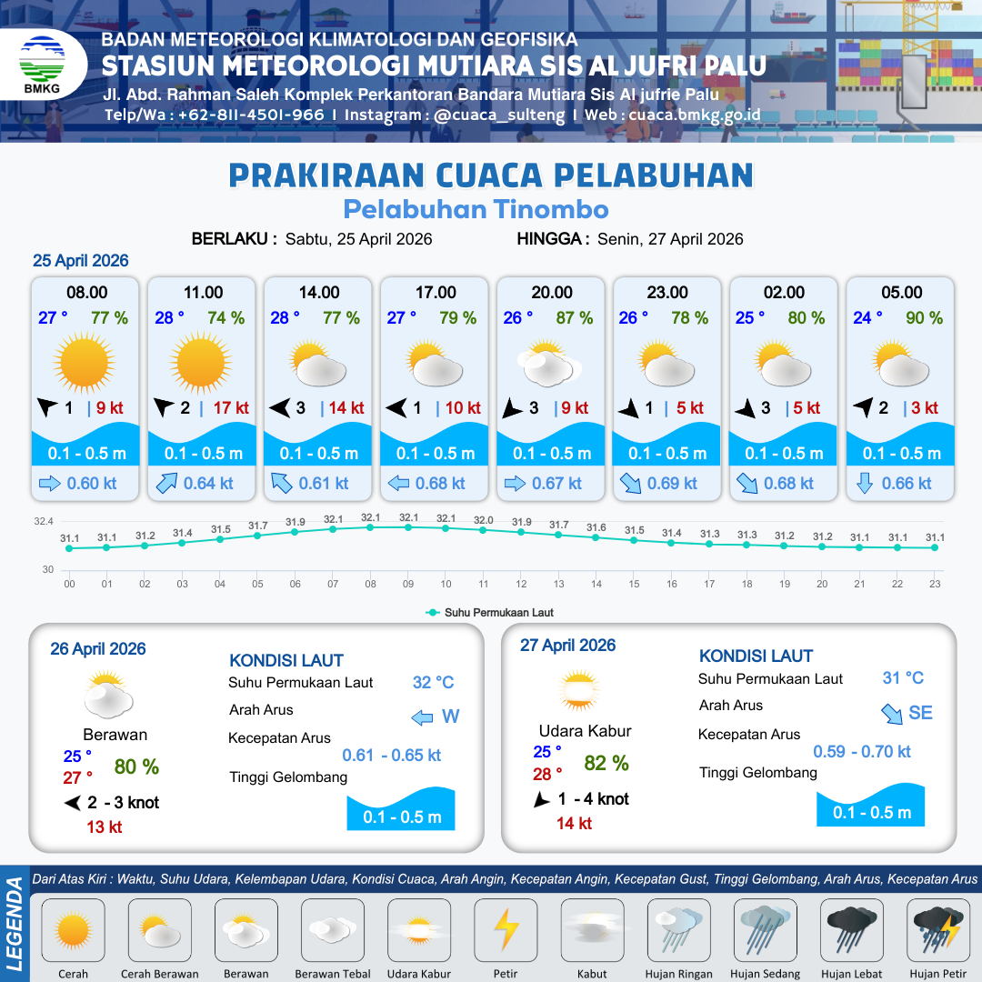 24 Apr 26, 13.00 13 jam kedepan | Tenggara 1 kt Gust Peningkatan kecepatan angin yang singkat dan tiba-tiba : 6 kt | 0.3 m Tenang | Selatan 0.6 Knot | 10 km | 27 °C | 84 % | -0.05 m | |