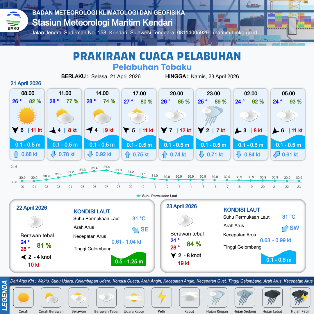 21 Apr 26, 09.00 15 jam yang lalu | Tenggara 5 kt Gust Peningkatan kecepatan angin yang singkat dan tiba-tiba : 11 kt | 0.2 m Tenang | Utara 0.8 Knot | 10 km | 27 °C | 80 % | +0.68 m | |