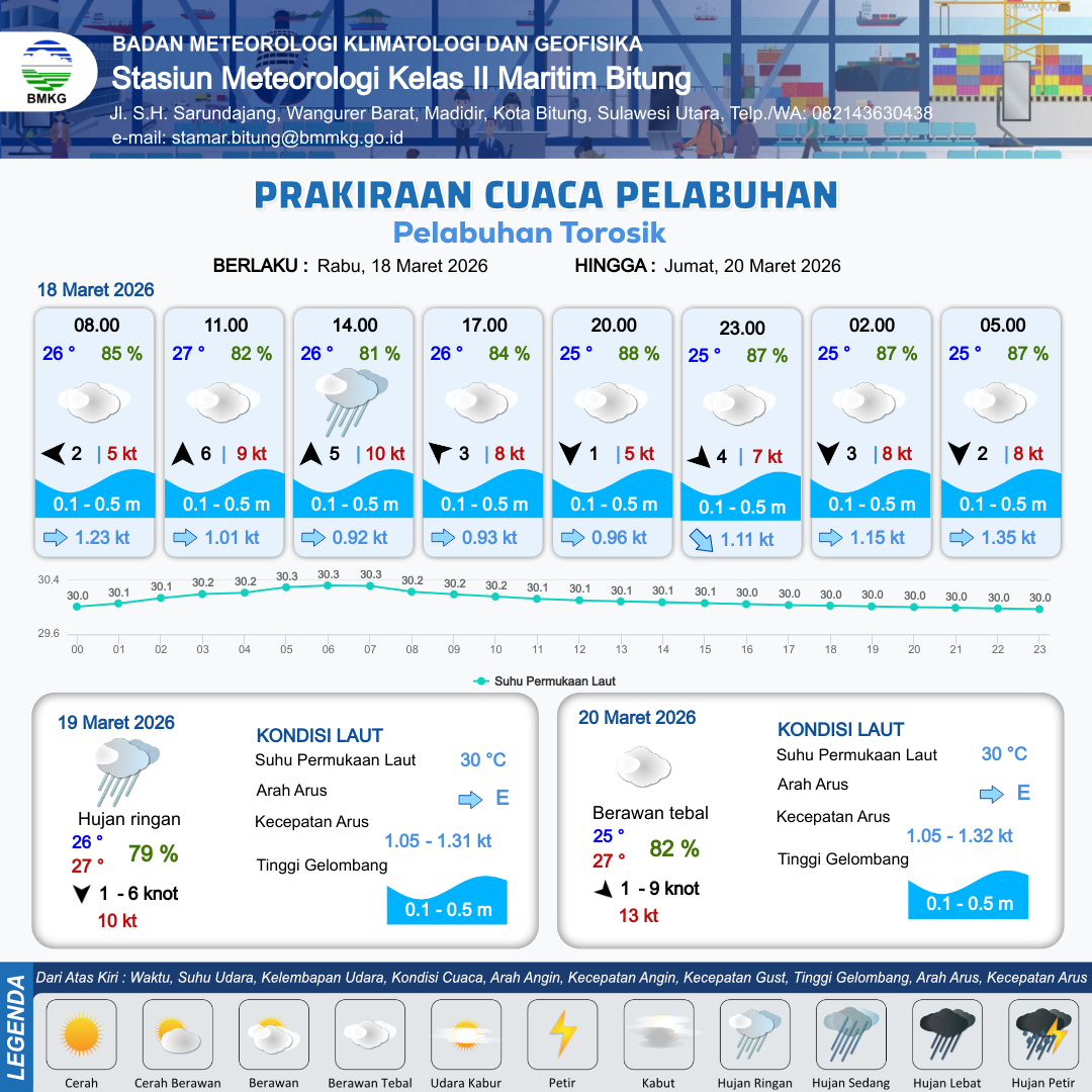 18 Mar 26, 22.00 3 jam kedepan | Berawan Tebal | Utara 2 kt Gust Peningkatan kecepatan angin yang singkat dan tiba-tiba : 8 kt | | | 10 km | 25 °C | 87 % | +0.15 m |