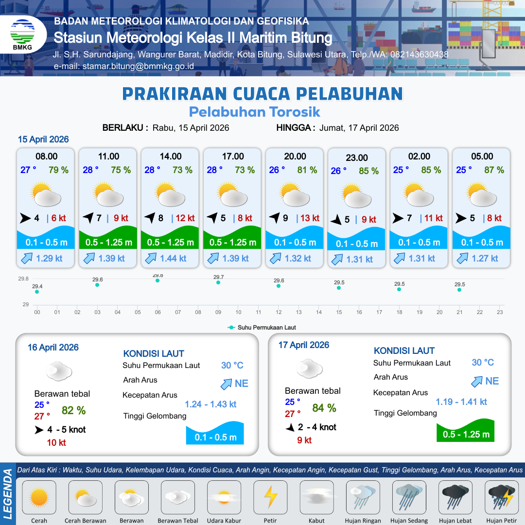14 Apr 26, 13.00 6 jam yang lalu | Cerah Berawan | Barat Laut 3 kt Gust Peningkatan kecepatan angin yang singkat dan tiba-tiba : 7 kt | | | 10 km | 26 °C | 87 % | +0.65 m |