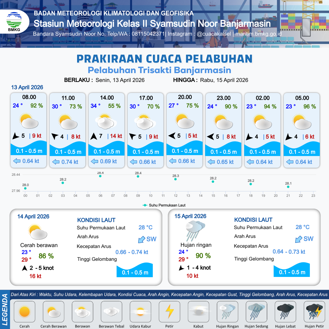 13 Apr 26, 11.00 4 jam kedepan | Timur 5 kt Gust Peningkatan kecepatan angin yang singkat dan tiba-tiba : 6 kt | 0.3 m Tenang | Barat 0.7 Knot | 9 km | 28 °C | 74 % | +0.55 m | |