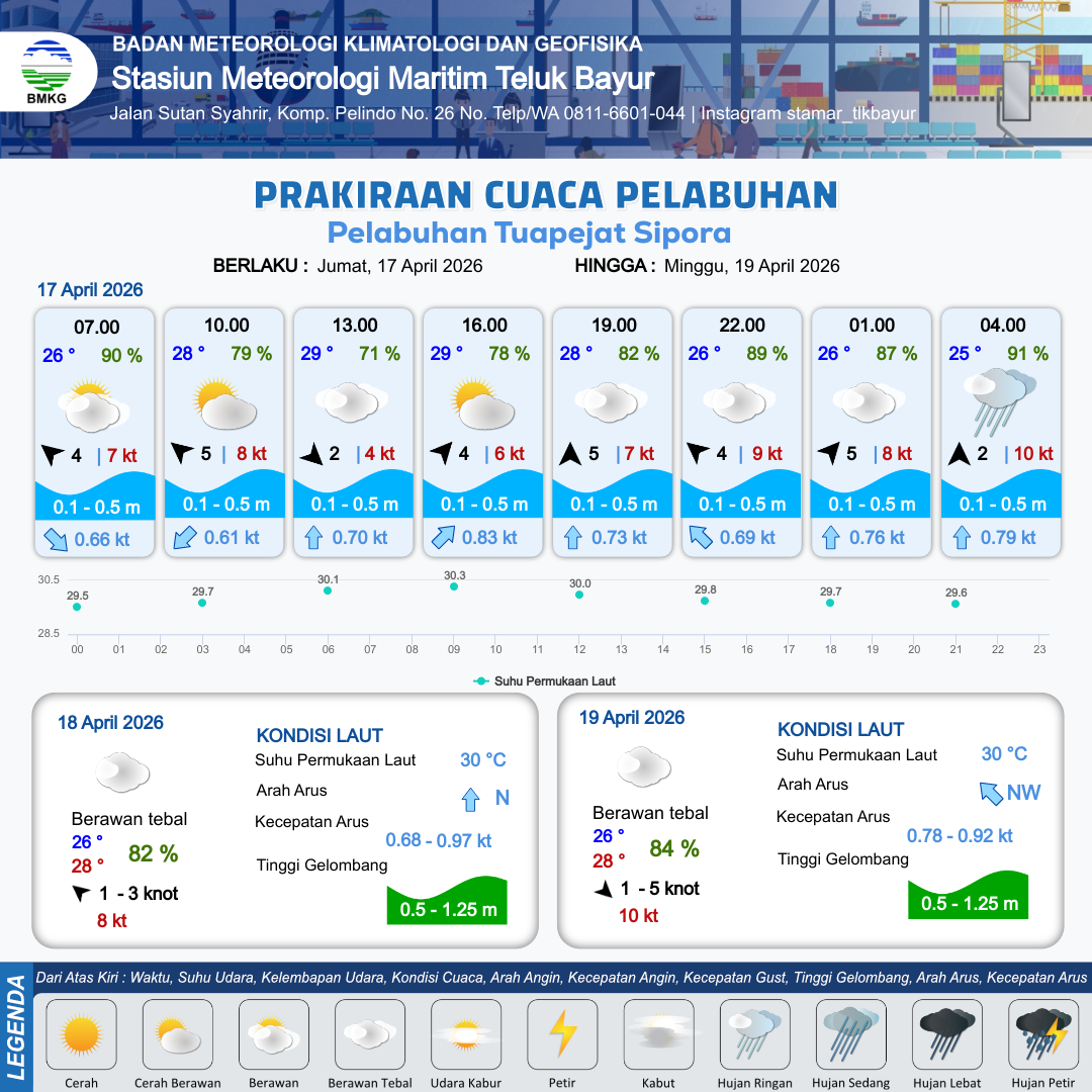 17 Apr 26, 16.00 17 jam kedepan | Tenggara 4 kt Gust Peningkatan kecepatan angin yang singkat dan tiba-tiba : 7 kt | 0.5 m Rendah | Barat Laut 0.7 Knot | 8 km | 27 °C | 86 % | +0.55 m | |
