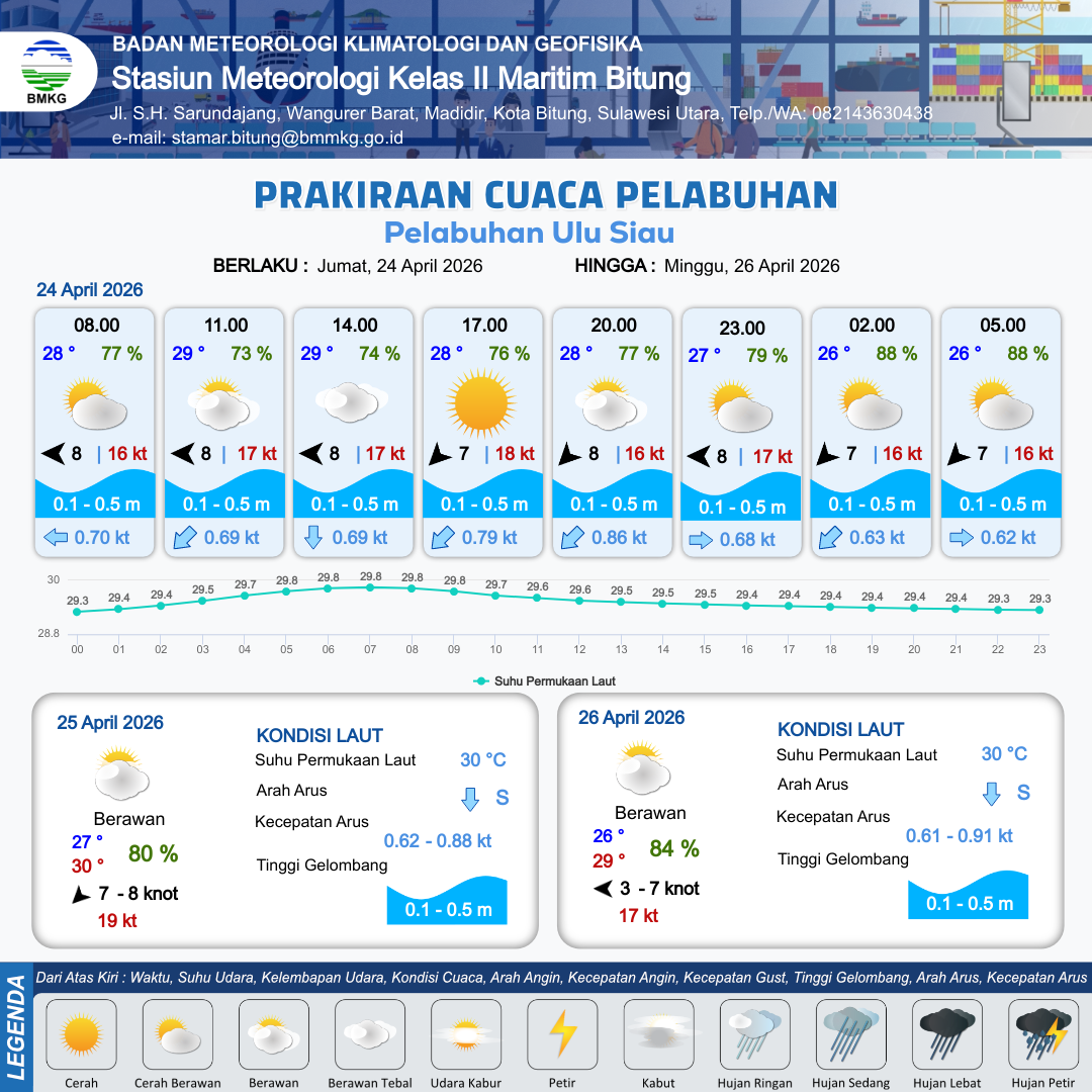 23 Apr 26, 23.00 4 jam kedepan | Cerah Berawan | Timur Laut 8 kt Gust Peningkatan kecepatan angin yang singkat dan tiba-tiba : 16 kt | | | 9 km | 27 °C | 82 % | +0.09 m |