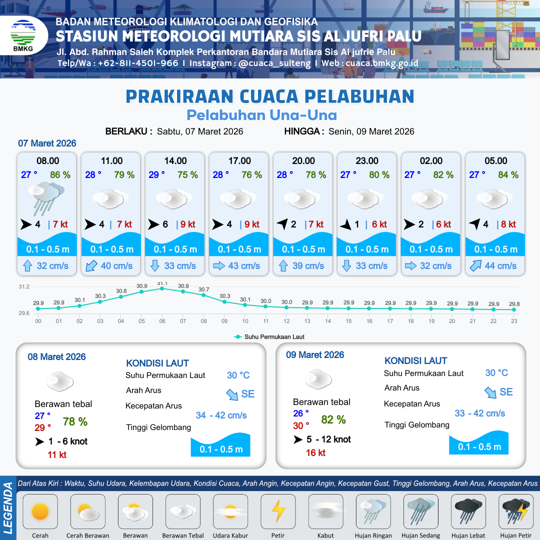 7 Mar 26, 23.00 3 jam kedepan | Berawan Tebal | Barat 4 kt Gust Peningkatan kecepatan angin yang singkat dan tiba-tiba : 7 kt | | | 10 km | 27 °C | 81 % | +0.58 m |