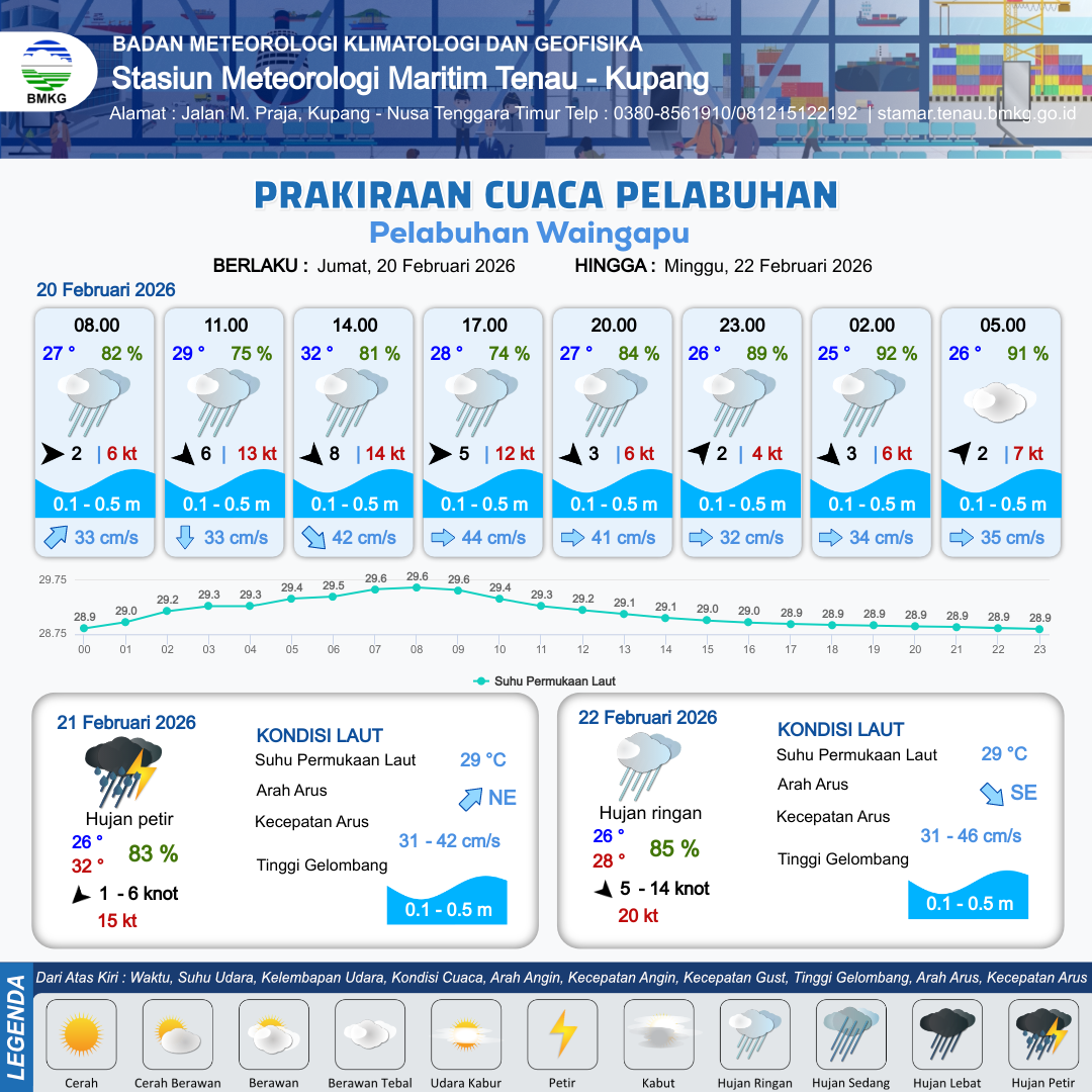 20 Feb 26, 22.00 5 jam kedepan | Hujan Ringan | Barat Daya 2 kt Gust Peningkatan kecepatan angin yang singkat dan tiba-tiba : 10 kt | | | 8 km | 26 °C | 90 % | -1.16 m |