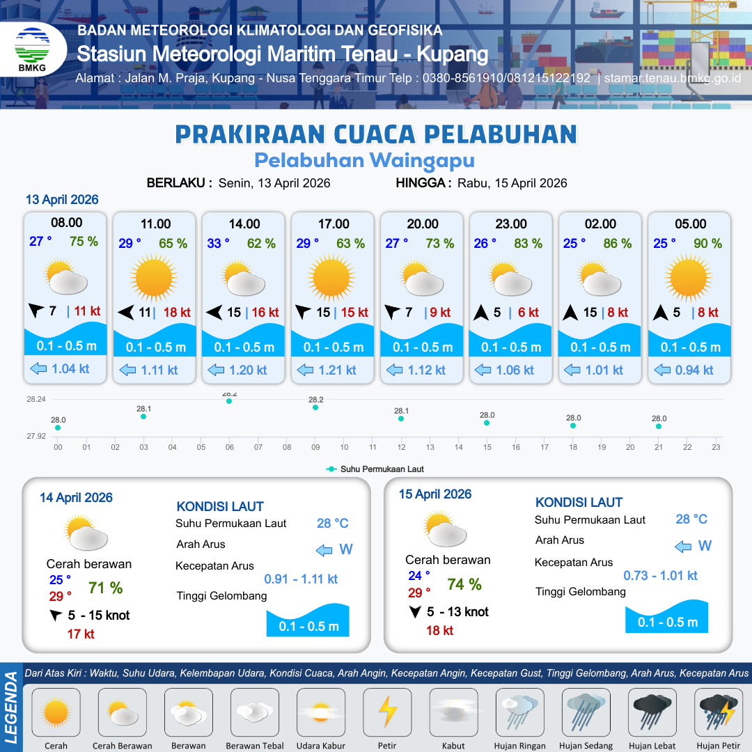 13 Apr 26, 23.00 10 jam kedepan | Tenggara 5 kt Gust Peningkatan kecepatan angin yang singkat dan tiba-tiba : 8 kt | 0.4 m Tenang | Barat 0.9 Knot | 10 km | 26 °C | 84 % | +0.54 m |