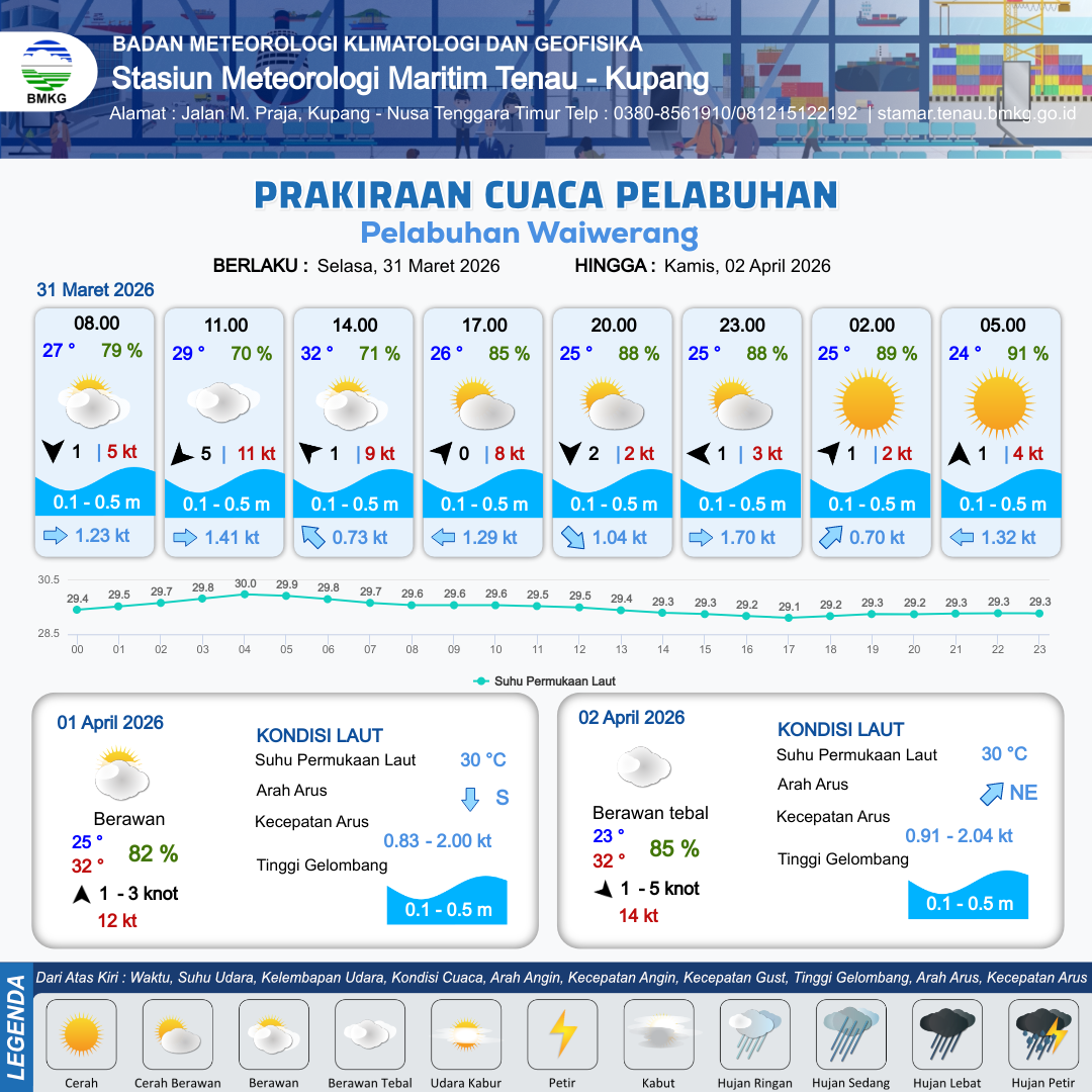 31 Mar 26, 10.00 9 jam yang lalu | Cerah Berawan | Barat Daya 0 kt Gust Peningkatan kecepatan angin yang singkat dan tiba-tiba : 5 kt | | | 10 km | 25 °C | 88 % | -0.55 m |