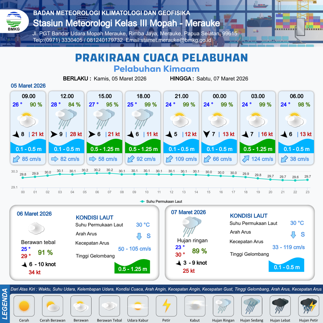5 Mar 26, 09.00 9 jam kedepan | Barat Laut 3 kt Gust Peningkatan kecepatan angin yang singkat dan tiba-tiba : 10 kt | 1 m Rendah | Barat Laut 45.0 cm/s | 5 km | 25 °C | 98 % | +1.13 m | |