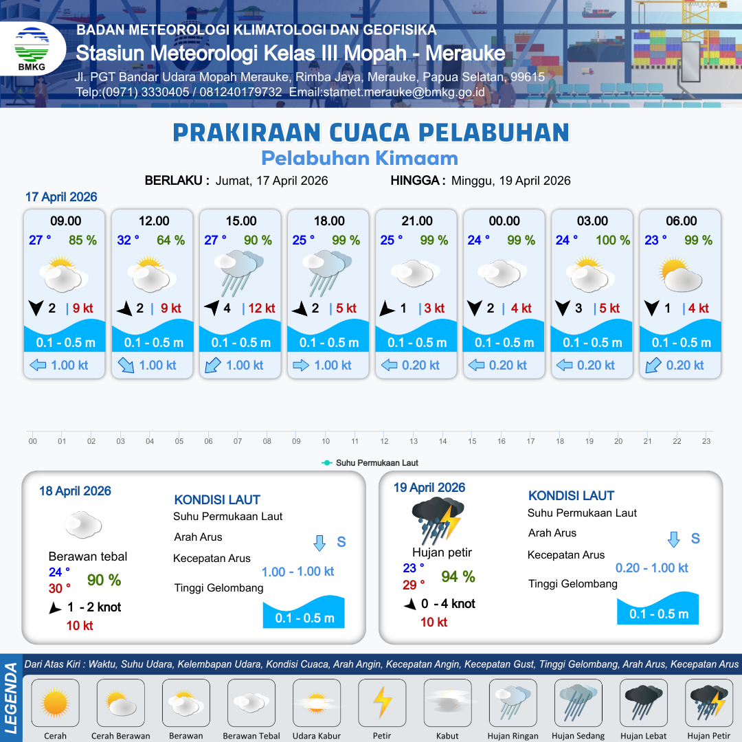 17 Apr 26, 23.00 8 jam kedepan | Barat Laut 2 kt Gust Peningkatan kecepatan angin yang singkat dan tiba-tiba : 6 kt | 0.4 m Tenang | Selatan 1.0 Knot | 10 km | 27 °C | 91 % | +1.40 m |