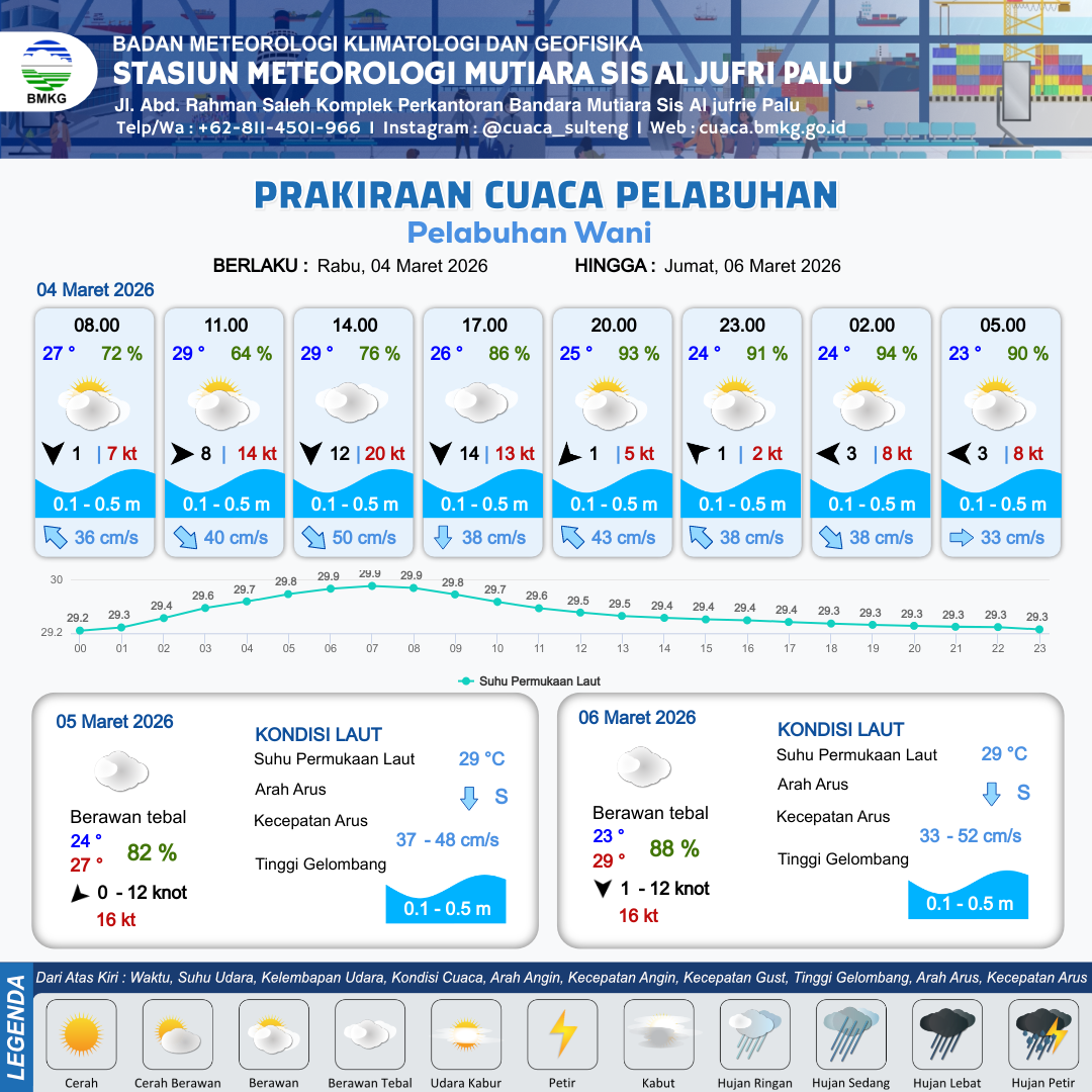 3 Mar 26, 23.00 4 jam kedepan | Berawan Tebal | Barat Laut 1 kt Gust Peningkatan kecepatan angin yang singkat dan tiba-tiba : 7 kt | | | 9 km | 24 °C | 85 % | +0.43 m |