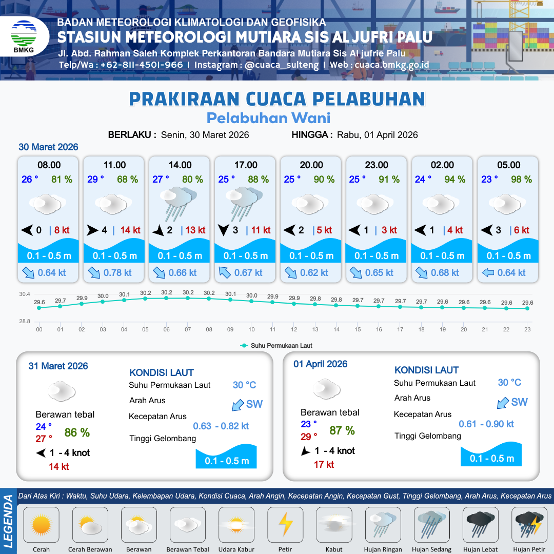 30 Mar 26, 23.00 10 jam kedepan | Barat 1 kt Gust Peningkatan kecepatan angin yang singkat dan tiba-tiba : 6 kt | 0.1 m Tenang | Barat Laut 0.7 Knot | 9 km | 24 °C | 94 % | +0.23 m |