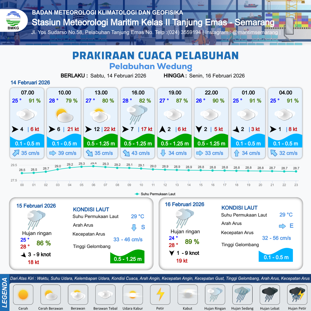 14 Feb 26, 04.00 15 jam yang lalu | Cerah Berawan | Barat 6 kt Gust Peningkatan kecepatan angin yang singkat dan tiba-tiba : 20 kt | | | 10 km | 28 °C | 79 % | -0.26 m |