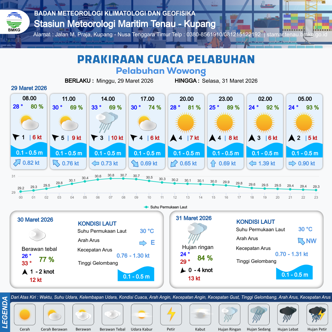 29 Mar 26, 15.00 Saat ini | Selatan 4 kt Gust Peningkatan kecepatan angin yang singkat dan tiba-tiba : 8 kt | 0.1 m Tenang | Utara 0.7 Knot | 8 km | 25 °C | 89 % | +0.35 m | |