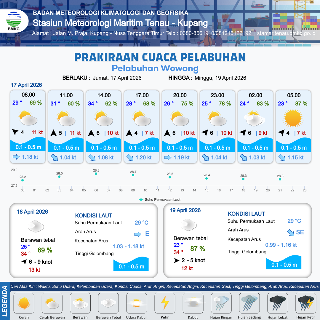 17 Apr 26, 16.00 7 jam kedepan | Barat Daya 6 kt Gust Peningkatan kecepatan angin yang singkat dan tiba-tiba : 9 kt | 0.4 m Tenang | Tenggara 1.0 Knot | 8 km | 25 °C | 80 % | +0.52 m | |