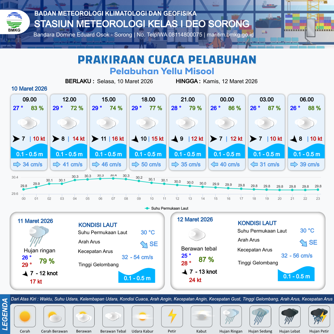 10 Mar 26, 06.00 12 jam yang lalu | Berawan Tebal | Barat 11 kt Gust Peningkatan kecepatan angin yang singkat dan tiba-tiba : 16 kt | | | 10 km | 29 °C | 74 % | +0.02 m |