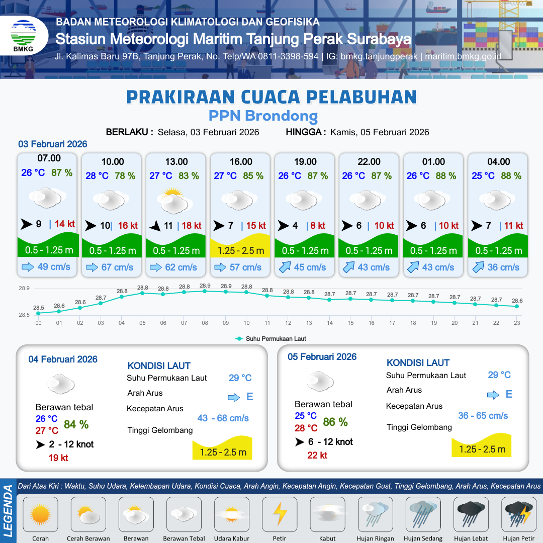 3 Feb 26, 23.00 5 jam kedepan | Berawan Tebal | Barat 6 kt Gust Peningkatan kecepatan angin yang singkat dan tiba-tiba : 11 kt | | | 10 km | 25 °C | 87 % | -0.25 m |