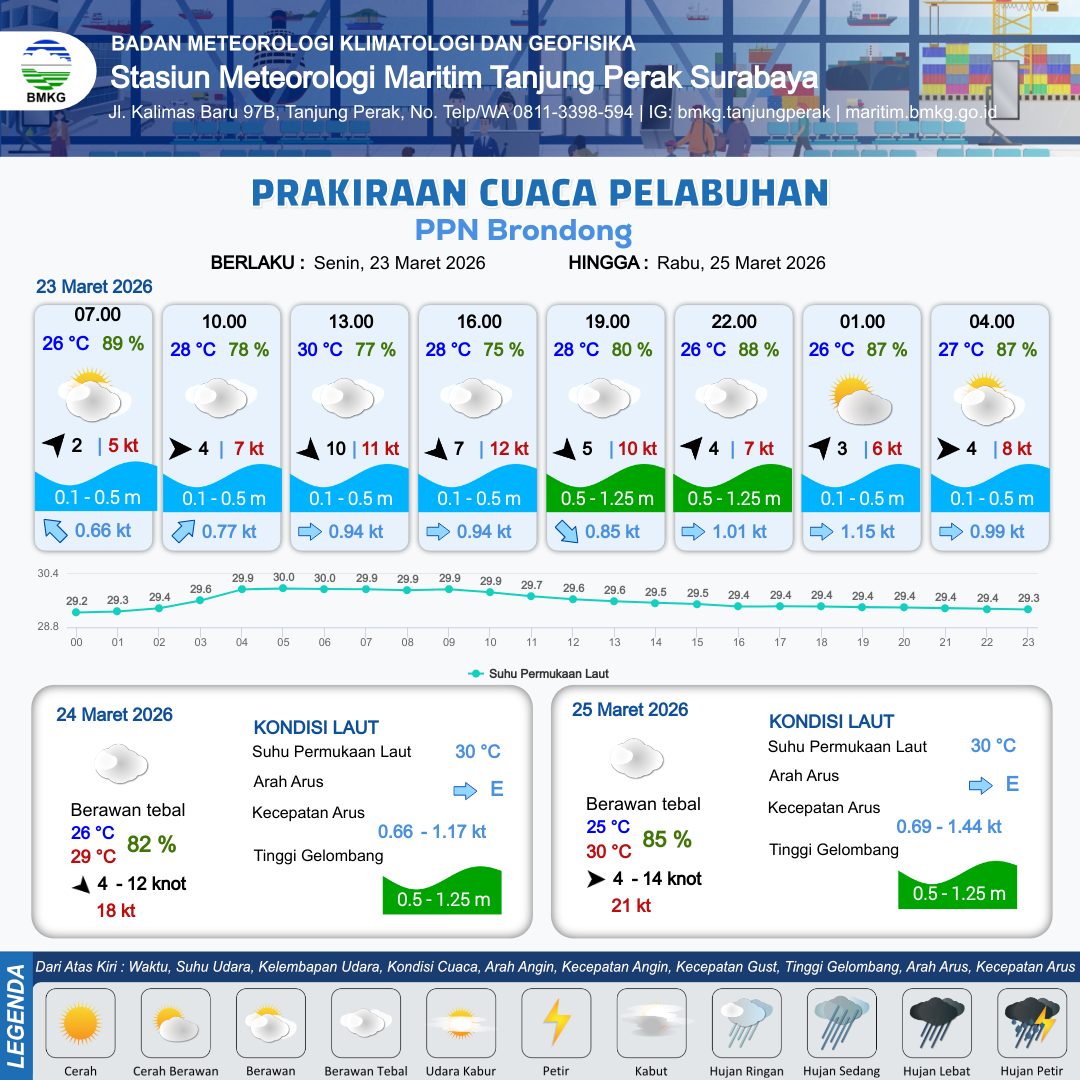 23 Mar 26, 23.00 7 jam kedepan | Barat Daya 4 kt Gust Peningkatan kecepatan angin yang singkat dan tiba-tiba : 8 kt | 0.5 m Rendah | Timur 0.7 Knot | 10 km | 26 °C | 87 % | -0.02 m |