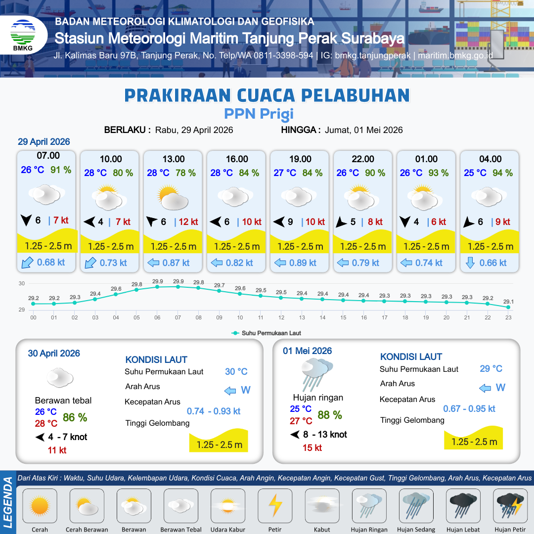 29 Apr 26, 14.00 2 jam kedepan | Timur Laut 5 kt Gust Peningkatan kecepatan angin yang singkat dan tiba-tiba : 8 kt | 1.9 m Sedang | Barat 0.8 Knot | 10 km | 26 °C | 89 % | +0.47 m | |