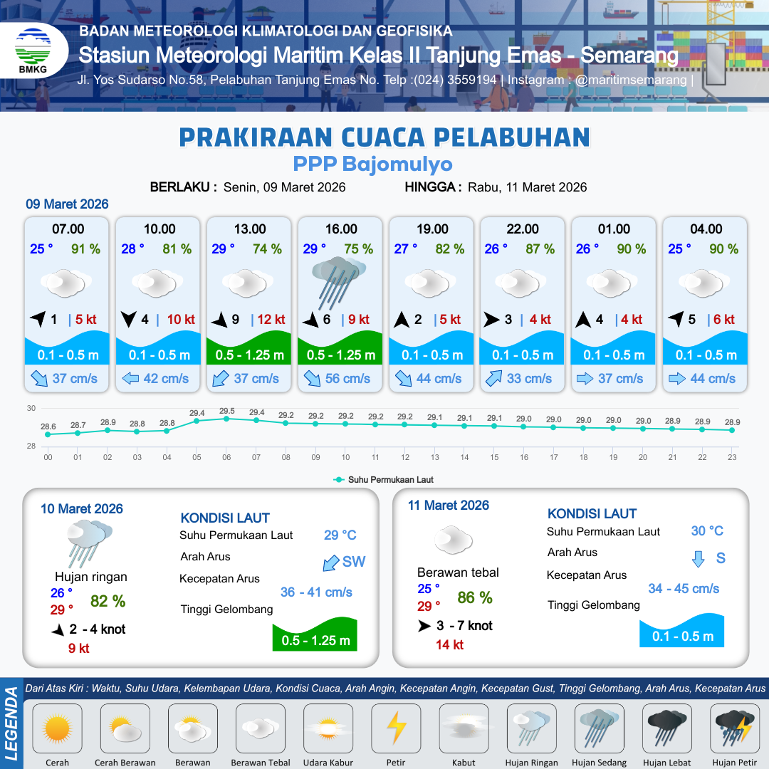 9 Mar 26, 21.00 4 jam kedepan | Berawan Tebal | Barat Daya 5 kt Gust Peningkatan kecepatan angin yang singkat dan tiba-tiba : 6 kt | | | 8 km | 25 °C | 90 % | -0.33 m |