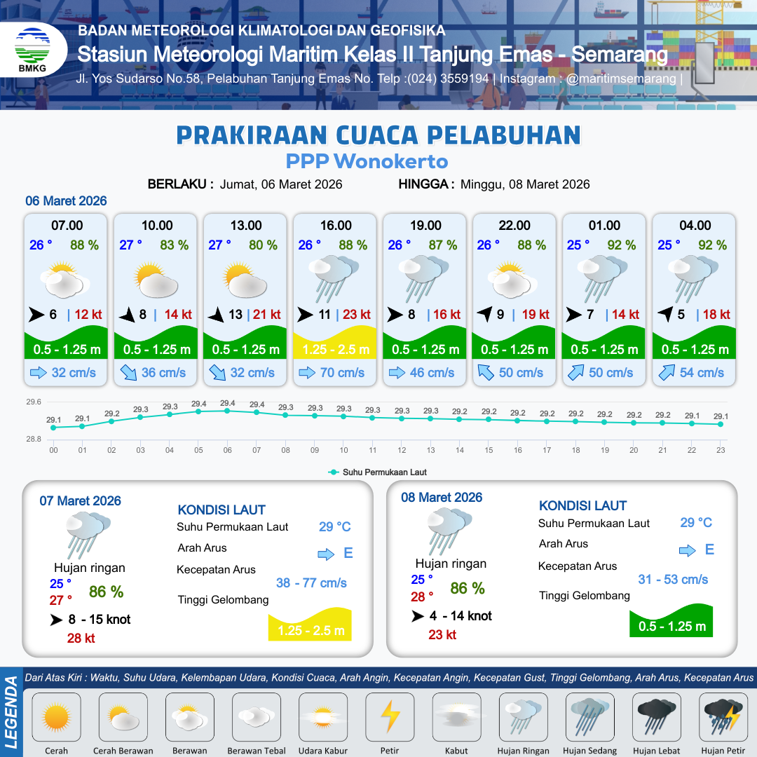 6 Mar 26, 12.00 12 jam kedepan | Barat 8 kt Gust Peningkatan kecepatan angin yang singkat dan tiba-tiba : 16 kt | 1.1 m Rendah | Timur 46.0 cm/s | 10 km | 26 °C | 87 % | -0.22 m | |