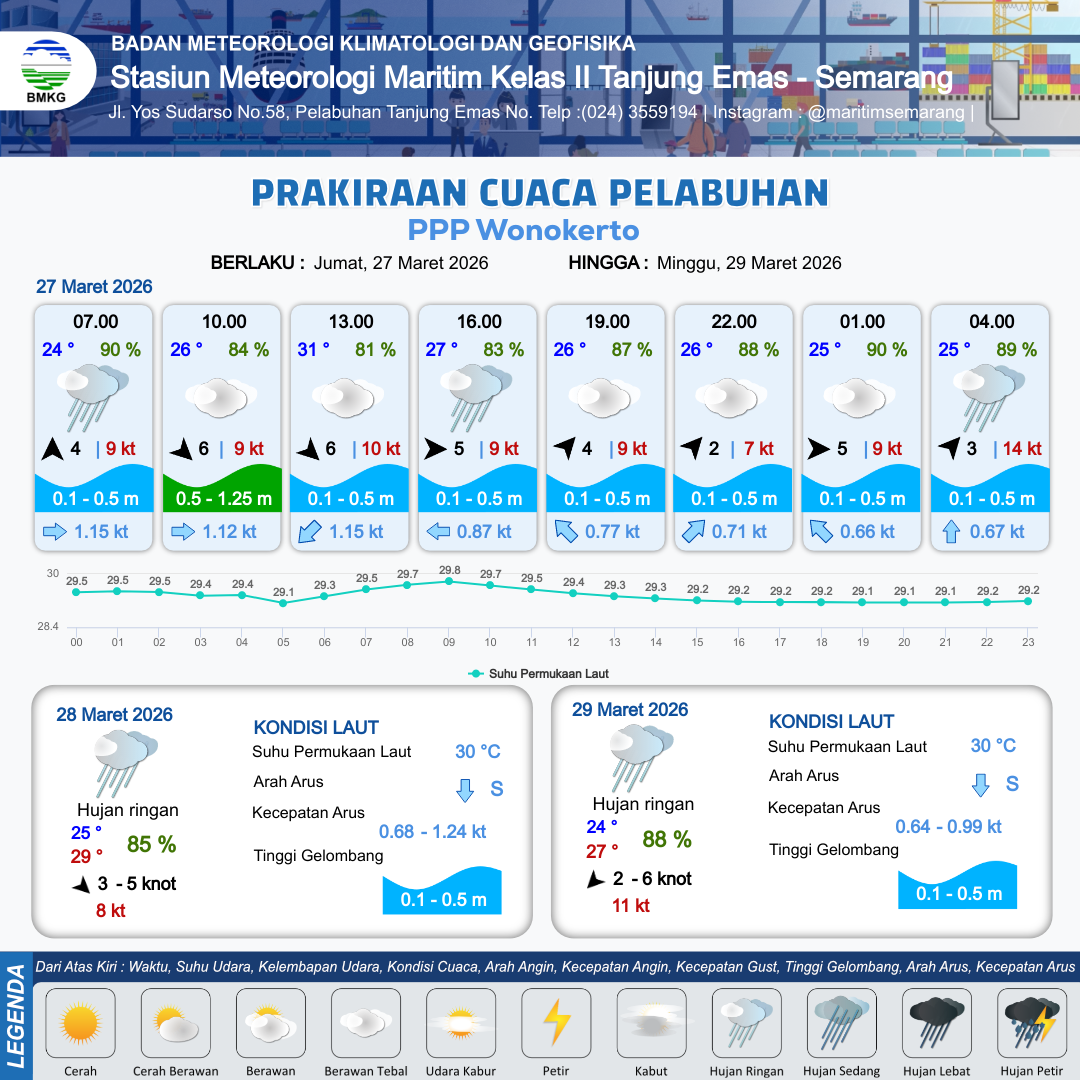 27 Mar 26, 22.00 3 jam kedepan | Hujan Ringan | Barat Daya 3 kt Gust Peningkatan kecepatan angin yang singkat dan tiba-tiba : 10 kt | | | 7 km | 25 °C | 90 % | +0.25 m |