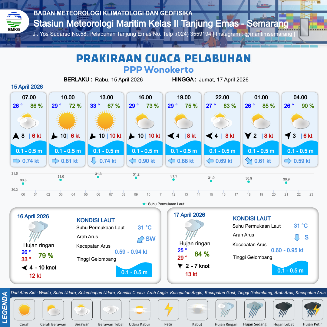 15 Apr 26, 05.00 2 jam kedepan | Timur Laut 10 kt Gust Peningkatan kecepatan angin yang singkat dan tiba-tiba : 9 kt | 0.4 m Tenang | Selatan 0.7 Knot | 10 km | 31 °C | 69 % | +0.63 m | |