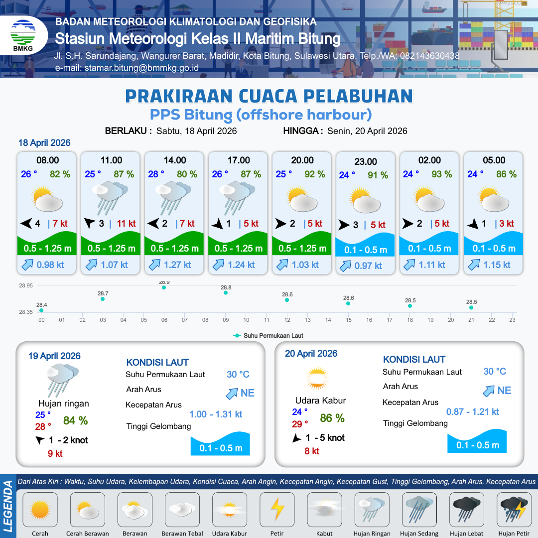 18 Apr 26, 17.00 2 jam kedepan | Barat 2 kt Gust Peningkatan kecepatan angin yang singkat dan tiba-tiba : 5 kt | 0.5 m Rendah | Timur Laut 1.1 Knot | 7 km | 24 °C | 92 % | +0.63 m | |