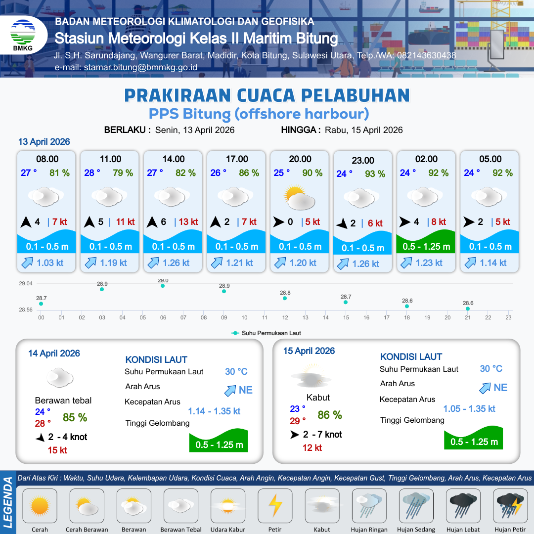 13 Apr 26, 23.00 2 jam kedepan | Barat 2 kt Gust Peningkatan kecepatan angin yang singkat dan tiba-tiba : 5 kt | 0.5 m Rendah | Timur Laut 1.1 Knot | 10 km | 25 °C | 87 % | +0.63 m |
