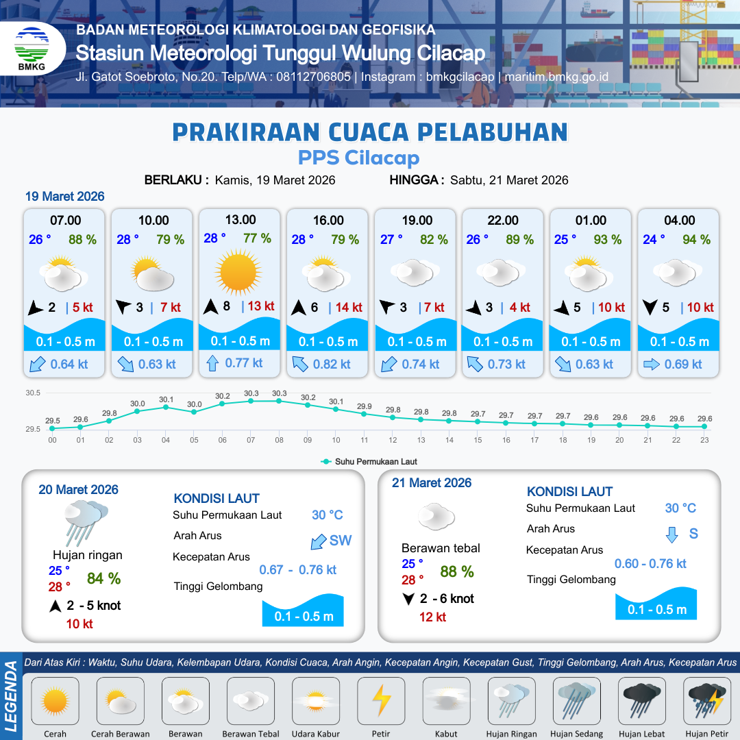 19 Mar 26, 10.00 9 jam yang lalu | Berawan | Selatan 6 kt Gust Peningkatan kecepatan angin yang singkat dan tiba-tiba : 11 kt | | | 7 km | 28 °C | 79 % | -0.20 m |