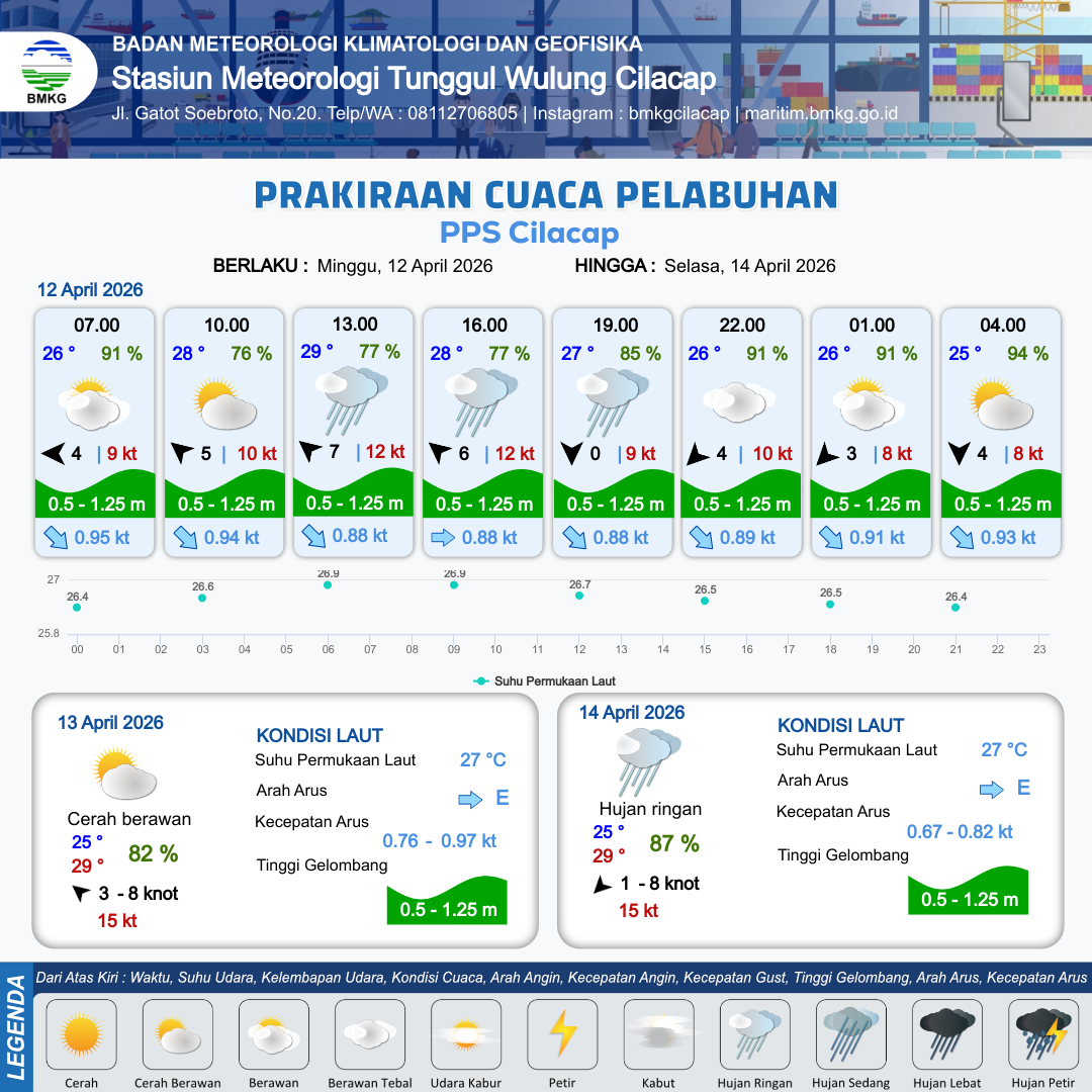 12 Apr 26, 12.00 6 jam kedepan | Utara 0 kt Gust Peningkatan kecepatan angin yang singkat dan tiba-tiba : 9 kt | 0.8 m Rendah | Timur 0.9 Knot | 6 km | 27 °C | 85 % | +0.00 m | |