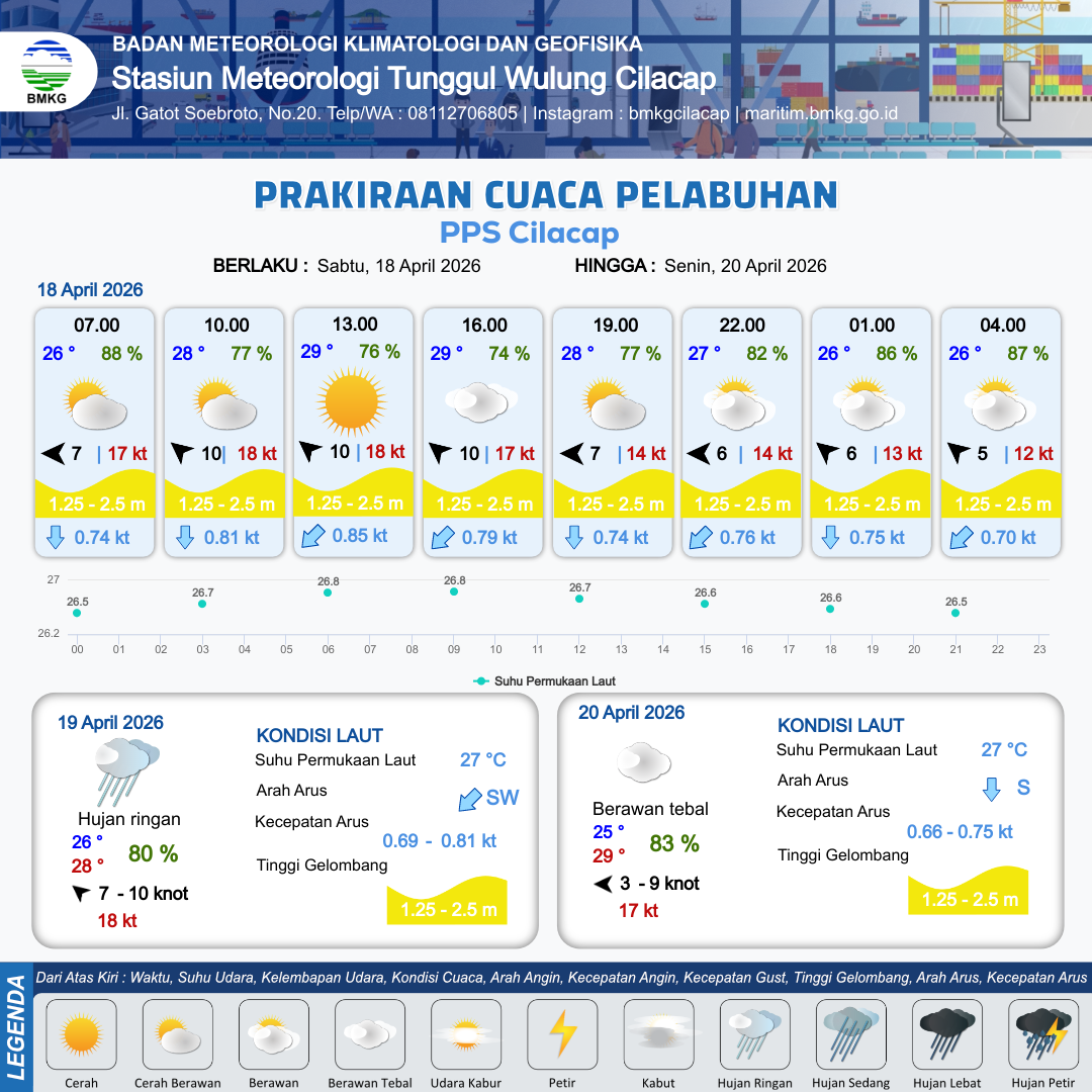 18 Apr 26, 03.00 2 jam kedepan | Tenggara 10 kt Gust Peningkatan kecepatan angin yang singkat dan tiba-tiba : 18 kt | 1.5 m Sedang | Selatan 0.8 Knot | 10 km | 28 °C | 77 % | +0.73 m | |