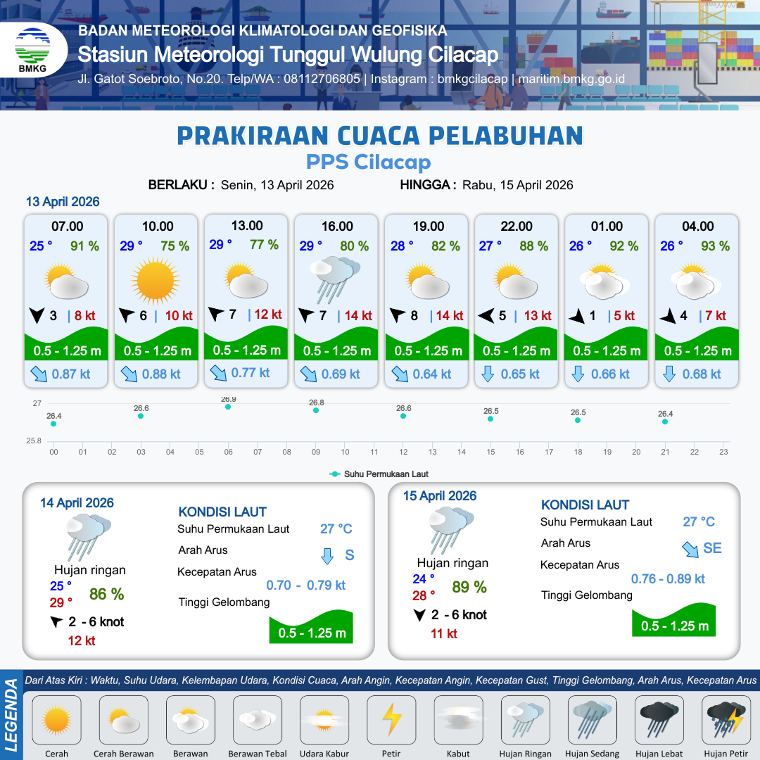 13 Apr 26, 21.00 2 jam kedepan | Berawan | Barat Laut 4 kt Gust Peningkatan kecepatan angin yang singkat dan tiba-tiba : 7 kt | | | 10 km | 26 °C | 93 % | +0.47 m |