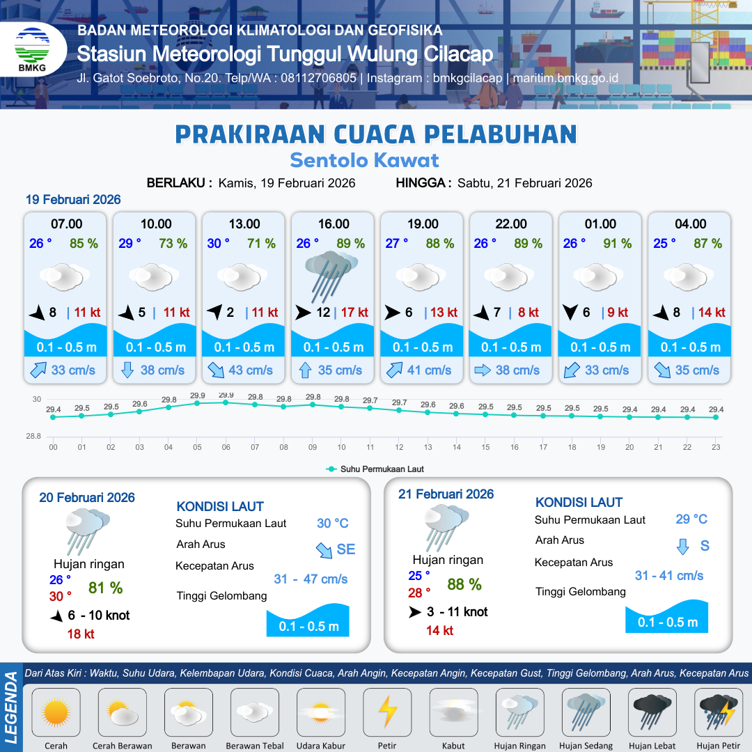 19 Feb 26, 14.00 3 jam kedepan | Barat Laut 7 kt Gust Peningkatan kecepatan angin yang singkat dan tiba-tiba : 10 kt | 0.1 m Tenang | Timur Laut 34.0 cm/s | 10 km | 26 °C | 89 % | +0.72 m | |