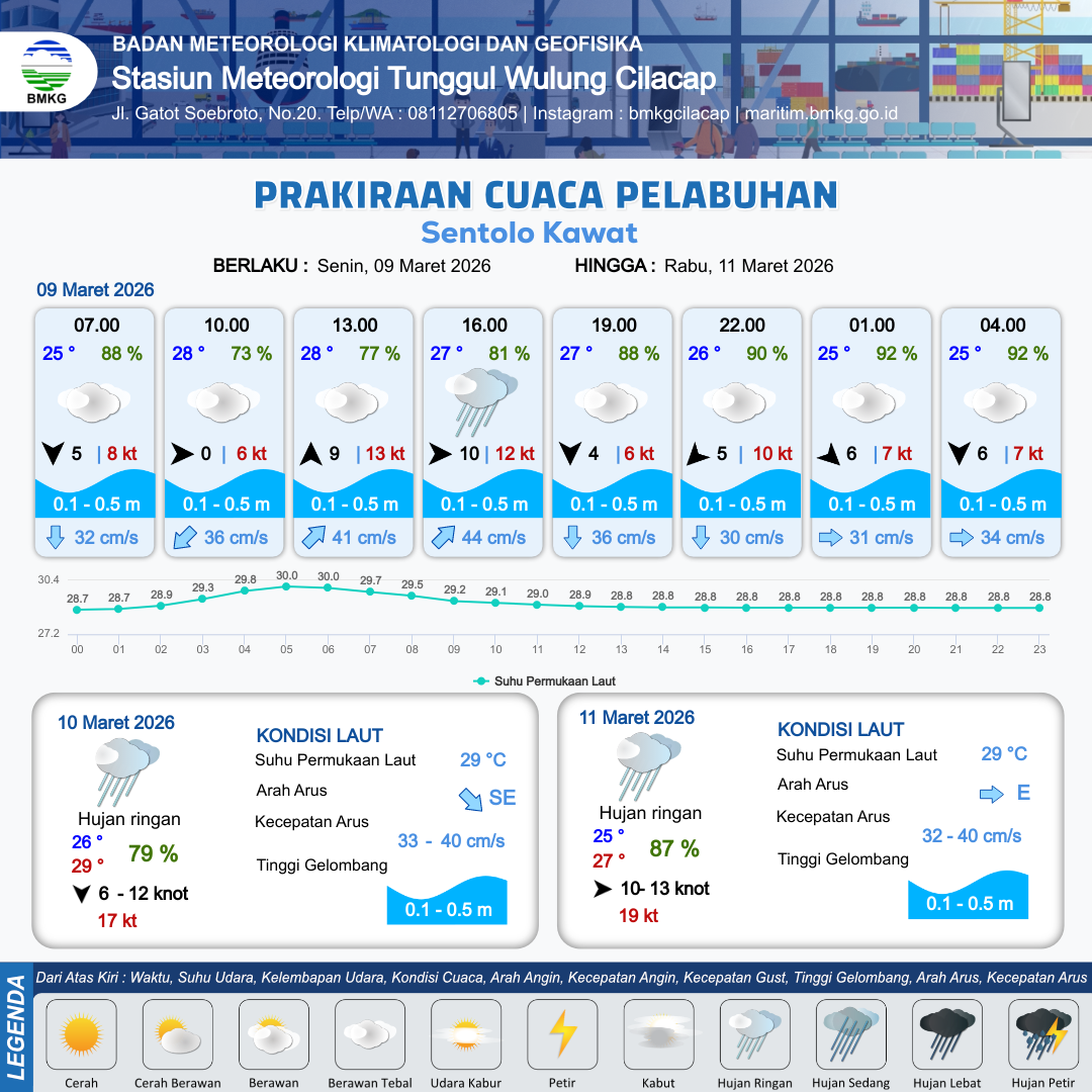 9 Mar 26, 21.00 4 jam kedepan | Berawan Tebal | Utara 6 kt Gust Peningkatan kecepatan angin yang singkat dan tiba-tiba : 7 kt | | | 10 km | 25 °C | 92 % | -0.24 m |