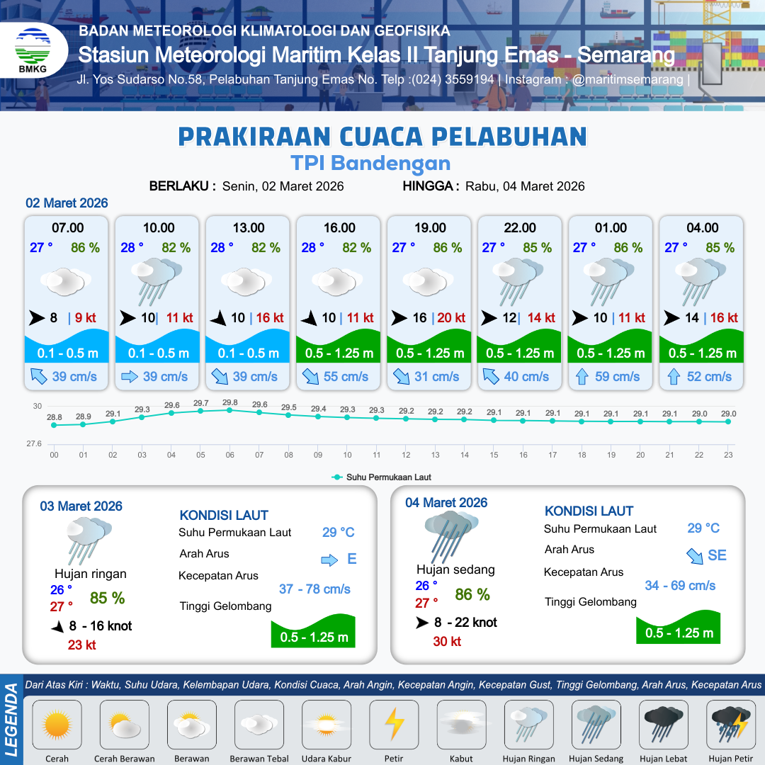 2 Mar 26, 21.00 2 jam kedepan | Hujan Ringan | Barat 14 kt Gust Peningkatan kecepatan angin yang singkat dan tiba-tiba : 16 kt | | | 6 km | 27 °C | 85 % | -0.42 m |