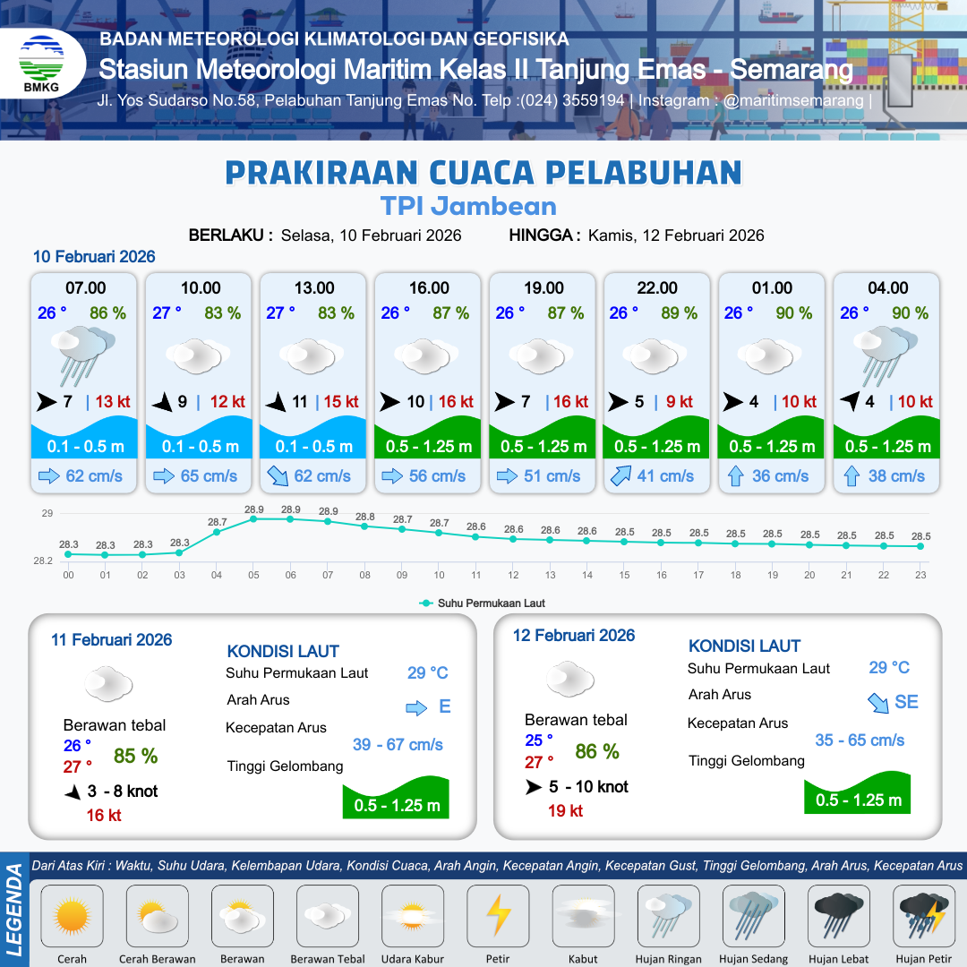 9 Feb 26, 20.00 2 jam kedepan | Berawan Tebal | Barat 5 kt Gust Peningkatan kecepatan angin yang singkat dan tiba-tiba : 9 kt | | | 8 km | 25 °C | 88 % | +0.47 m |
