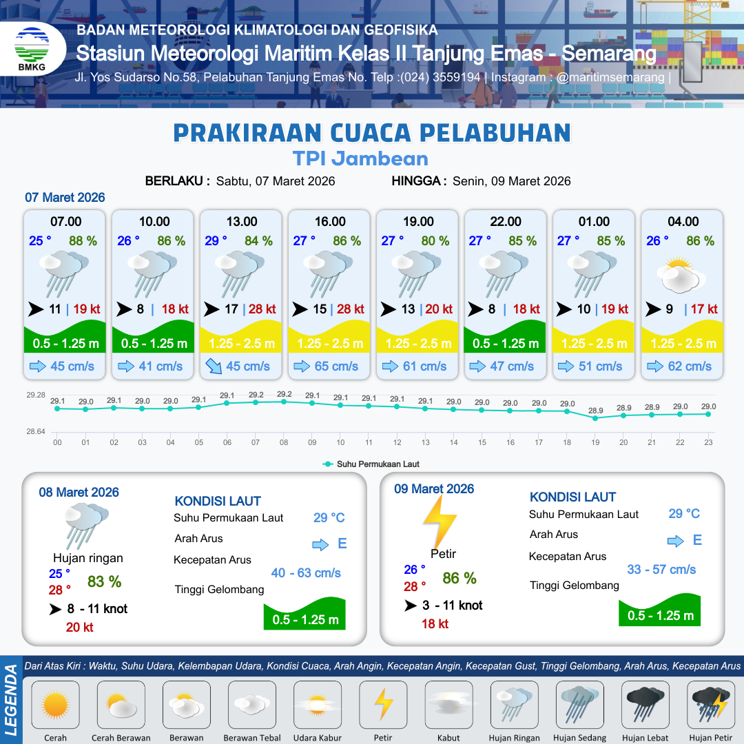 7 Mar 26, 03.00 4 jam kedepan | Barat 8 kt Gust Peningkatan kecepatan angin yang singkat dan tiba-tiba : 18 kt | 1.1 m Rendah | Timur 41.0 cm/s | 7 km | 26 °C | 86 % | -0.23 m | |