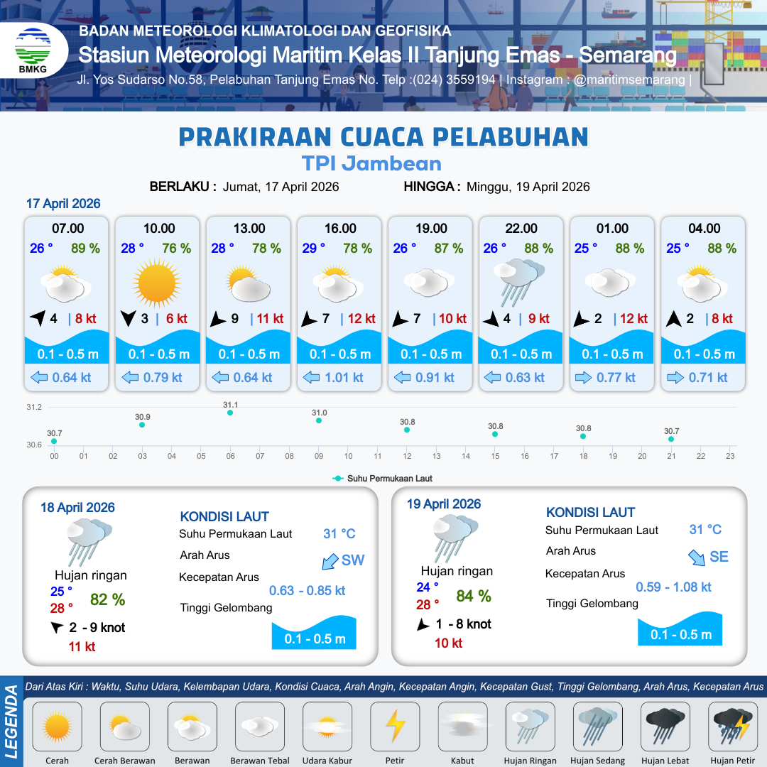 17 Apr 26, 10.00 9 jam yang lalu | Berawan | Timur Laut 7 kt Gust Peningkatan kecepatan angin yang singkat dan tiba-tiba : 11 kt | | | 7 km | 29 °C | 80 % | +0.68 m |