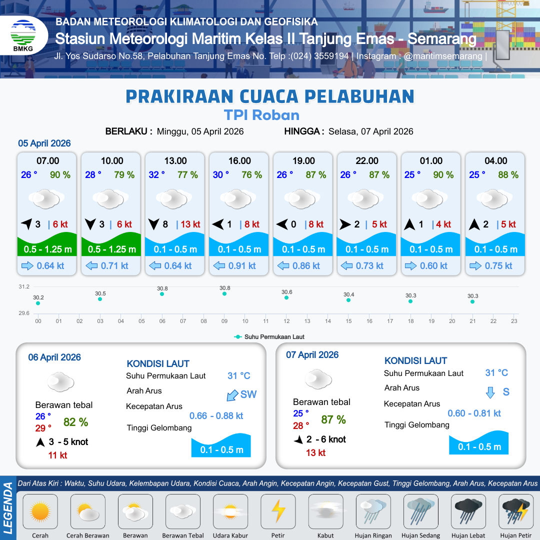4 Apr 26, 04.00 15 jam yang lalu | Berawan Tebal | Timur 10 kt Gust Peningkatan kecepatan angin yang singkat dan tiba-tiba : 18 kt | | | 7 km | 29 °C | 75 % | +0.73 m |