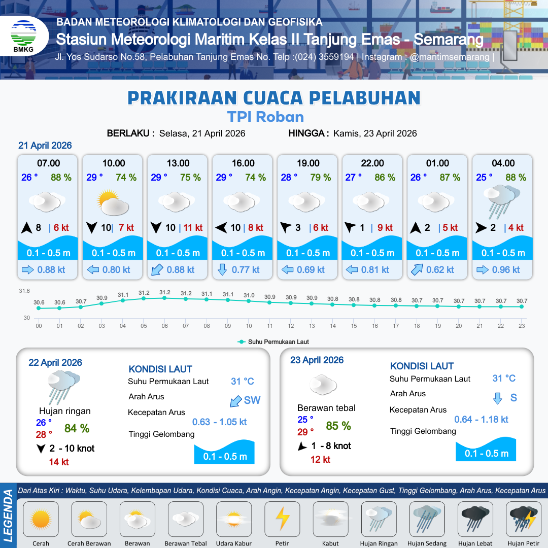 21 Apr 26, 23.00 Jam sebelumnya | Barat Daya 8 kt Gust Peningkatan kecepatan angin yang singkat dan tiba-tiba : 5 kt | 0.1 m Tenang | Timur 1.1 Knot | 10 km | 25 °C | 89 % | -0.36 m |