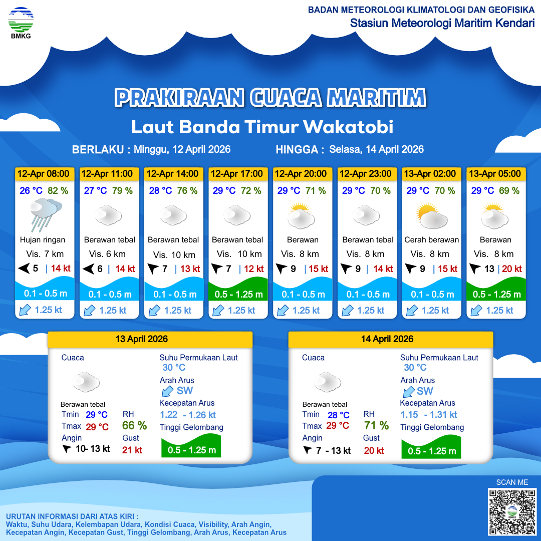 12 Apr 26, 23.00 4 jam kedepan | Cerah Berawan | Tenggara 13 kt Gust Peningkatan kecepatan angin yang singkat dan tiba-tiba : 21 kt | | | 29 °C | 66 % |